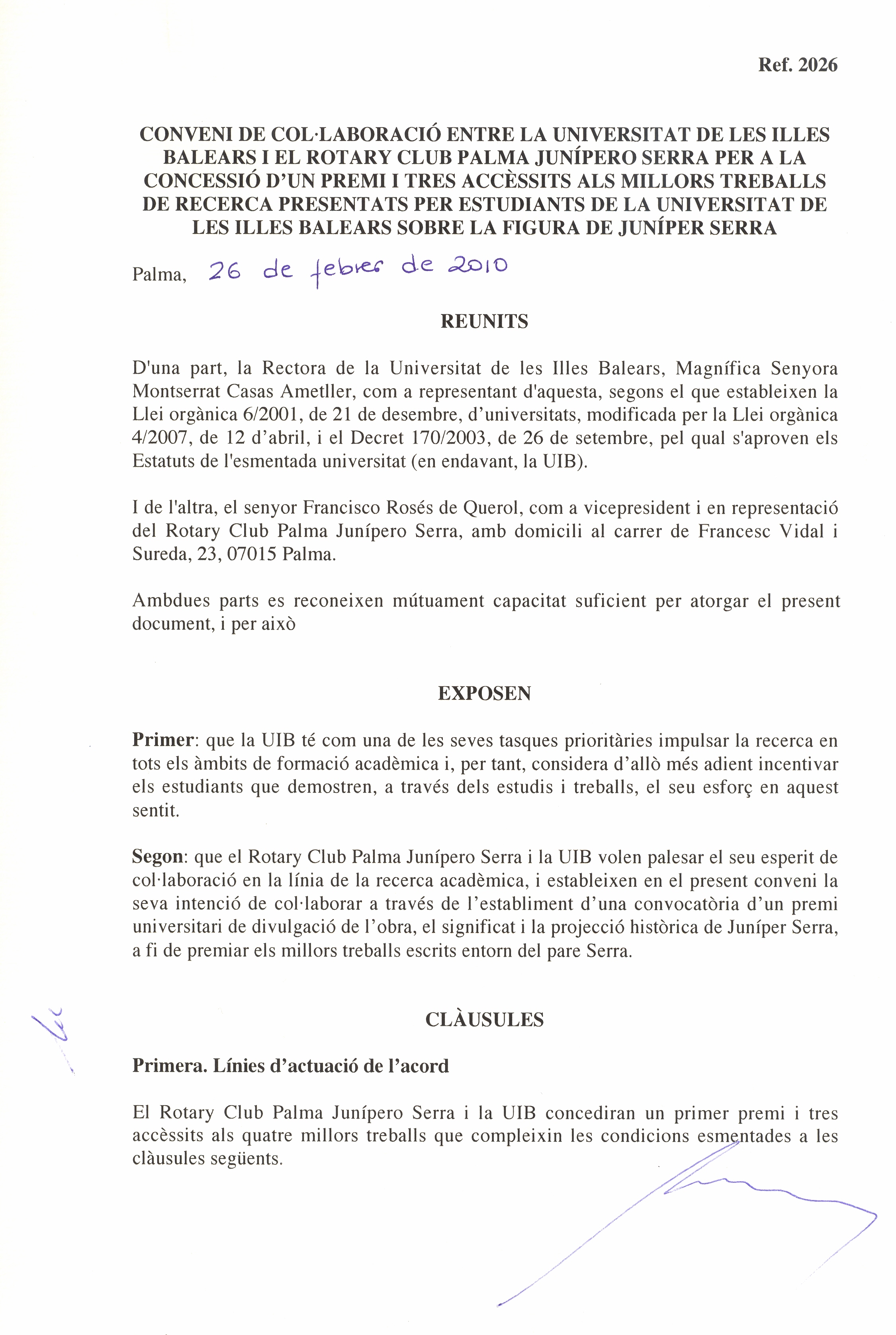 Como informamos en la pasada reunión, hoy, 26 de febrero,  se ha firmado el Convenio con la UIB para la concesión de un premio y tres accésits a los mejores trabajos de investigación sobre la figura de Junípero Serra. La noticia ha sido publicada en la web de la uib: http://www.uib.cat/ca con el correspondiente reportaje fotográfico. Por otra parte,  Pancho ha enviado ya a la prensa y al responsable de comunicaciones de Rotary la nota de informativa con una foto del acto.