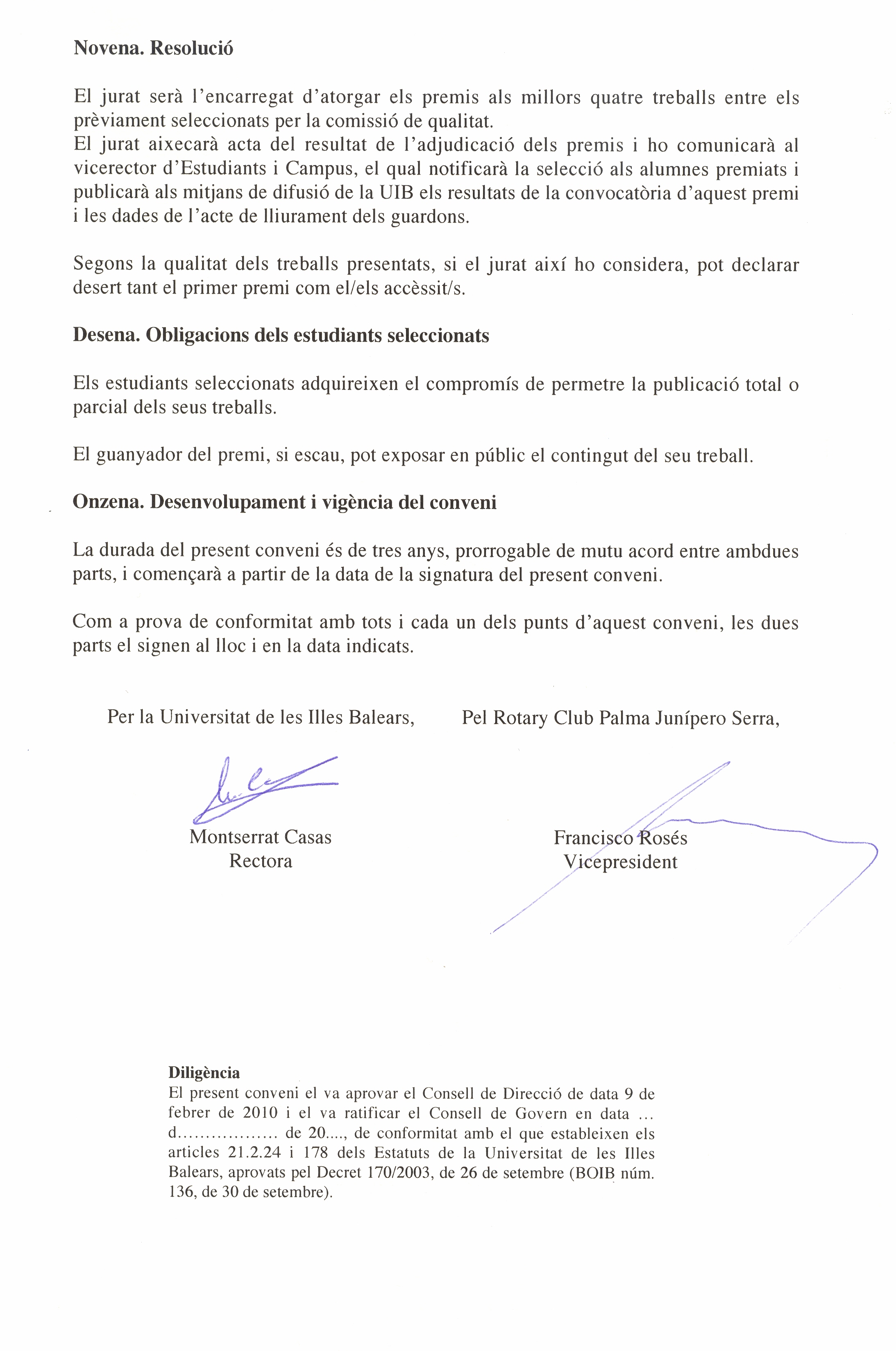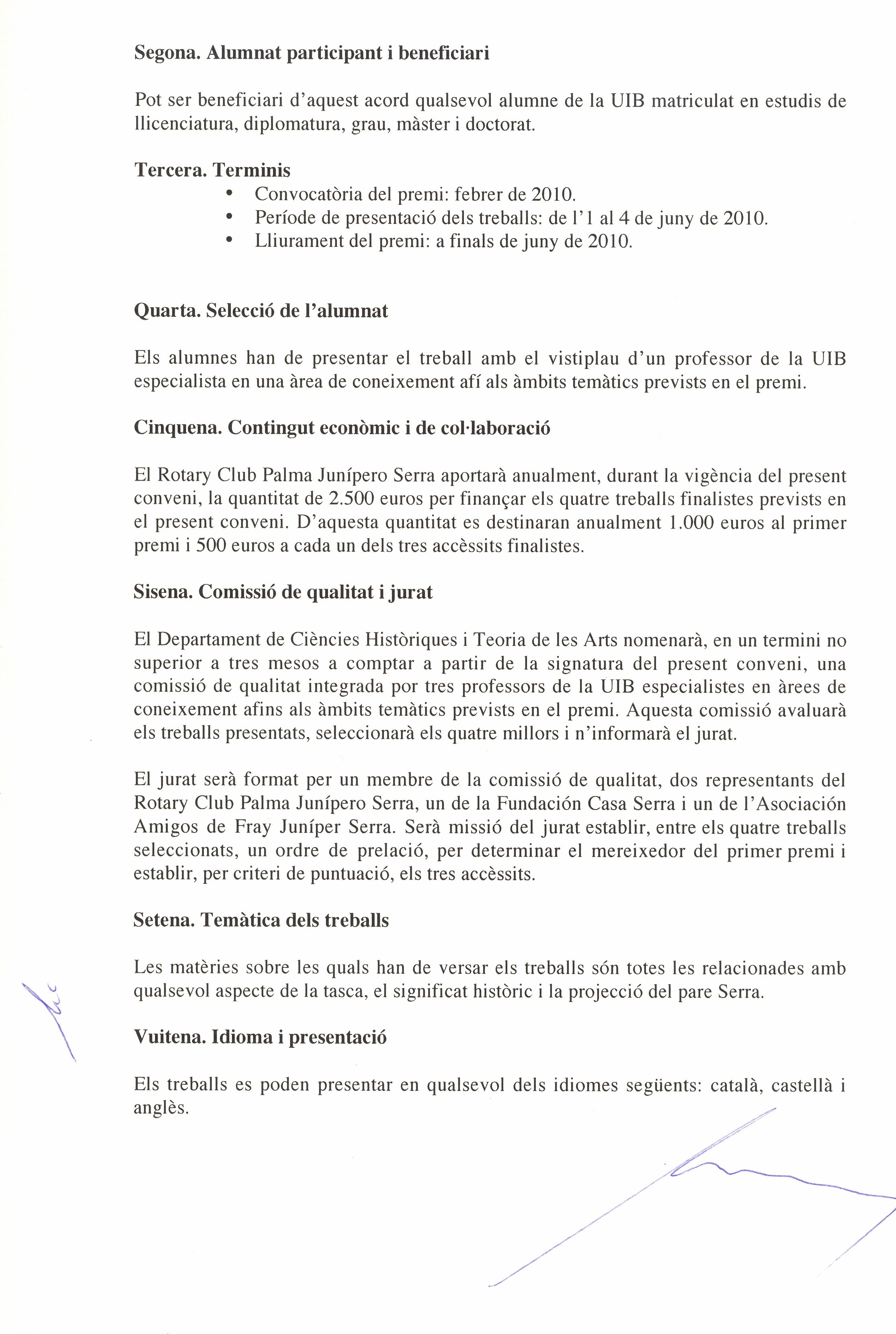 Os adjunto, escaneado, copia del Convenio firmado, así como el díptico que va a repartirse a partir del día 2 de marzo  (inicio de la convocatoria del Premio)  en el ámbito de la Universidad,  así como también por las Bibliotecas más significativas de Palma. El miércoles próximo os haremos llegar un folleto informativo  original sobre la convocatoria del Premio.
