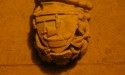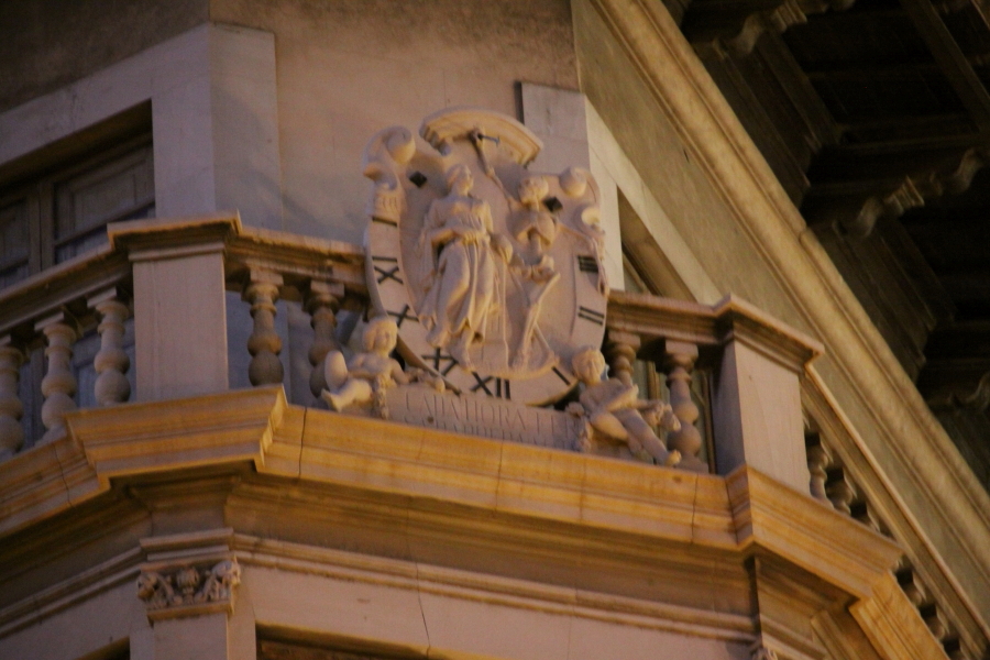 En el mismo edificio, pero en un lateral, hay una estatua de proporciones importantes, con una banderola recorriéndole el cuerpo. Lo que hay escrito es «ultima multis», que quiere decir, «esta hora es la última de muchos».
