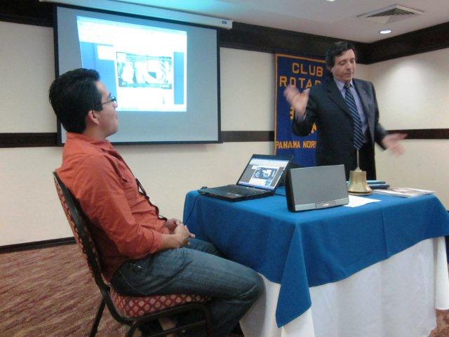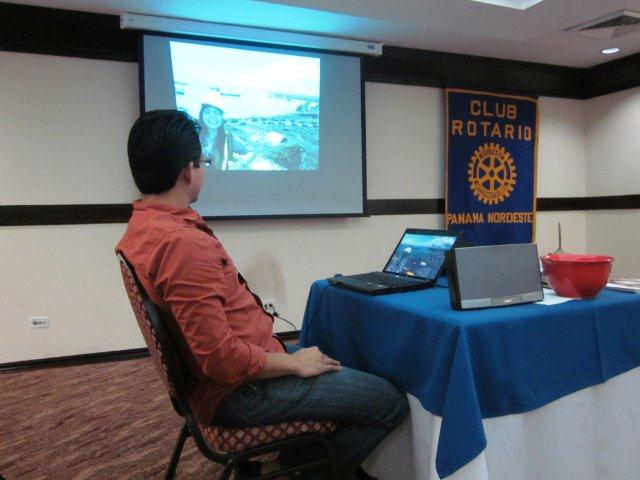 El presidente y el Macero dirigen la reunión al frente de un ordenador con proyector. Durante la cena se proyectaron dos vídeos de la página web de Rotary.org.