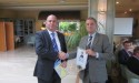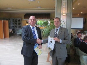 Nuestro presidente felicita a Juan Luis por su labor e intercambian los banderines de los clubes.
