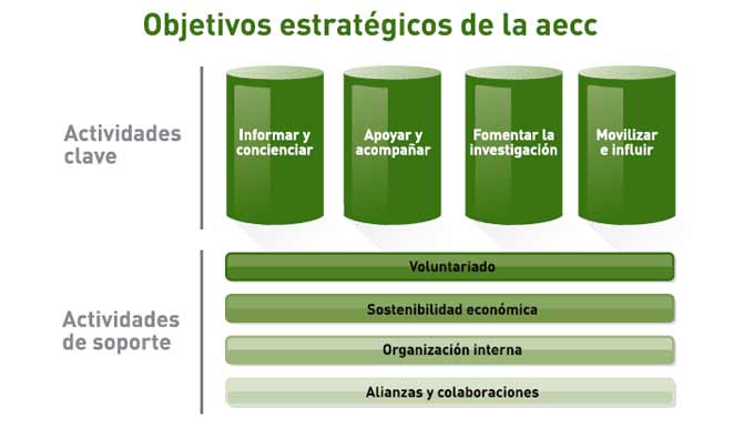 Las líneas de actuación clave de la aecc se apoyan en cuatro líneas de soporte: Voluntariado, sostenibilidad económica, organización interna y alianzas y colaboraciones.
