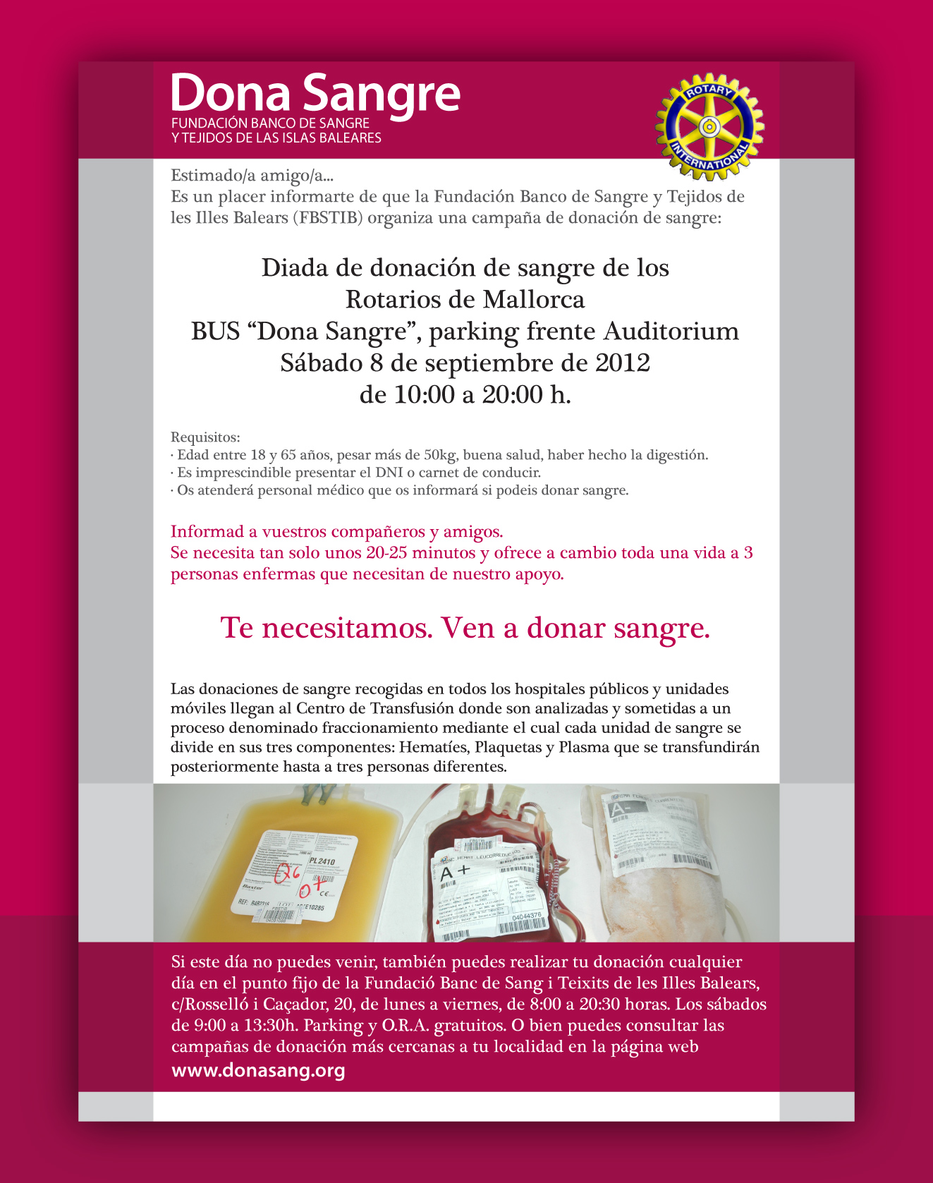 Queridos Presidentes, Secretarios y CICO’s de los clubes rotarios de la Zona 1-Illes Balears : Adjunto os remito comunicado sobre la celebración de la “Diada de donación de sangre”, que los clubes Rotarios de Mallorca, bajo la coordinación del RC Palma Almudaina y la organización del Banc de Sang i Teixits de les Illes Balears organizamos el próximo 8 de Septiembre (Sábado), entre las 10 h. y las 19 horas.
