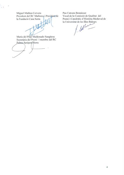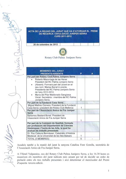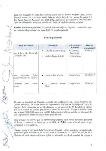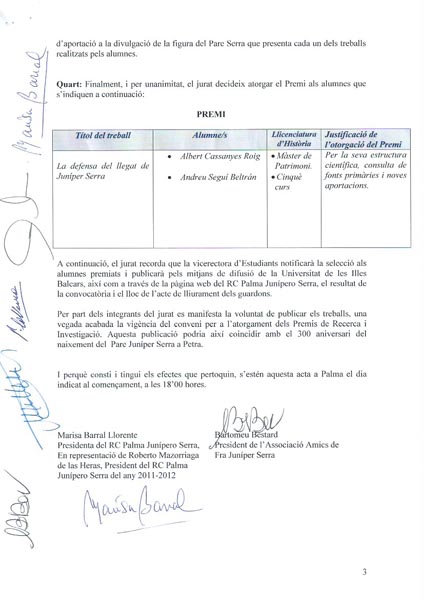 Después el Presidente del RC Palma Junípero Serra del año rotario 2011-2012, Roberto Mazorriaga y la Rectora de la UIB Monserrat Casas hicieron entrega de los talones a Albert Cassanyes Roig y Andreu Seguí (ausente al principio) con un importe total de 1.500 €, por su trabajo «La defensa del llegat de Juníper Serra».