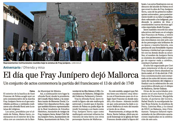 El sábado 13 de Abril se celebró la Ofrenda Floral a la figura de Fray Junípero Serra, en el día que se conmemora su partida desde Mallorca hacia tierras americanas, el 13 de Abril de 1749. El acto tuvo lugar ante el monumento erigido al Padre Serra en la Plaza de San Francisco de Palma, ante numeroso público y un amplio despliegue de medios de comunicación.