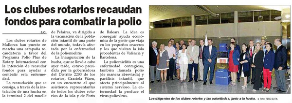 El pasado 17 de Septiembre tuvo lugar la inauguración de la «Hucha Rotaria» a favor de la Polio, en la Terminal 2 de Pelaires en el puerto de Palma. Al acto asistieron, el Director General de Farmacia del Govern Balear, el Director de la Autoridad Portuaria, también estuvo representada la Presidenta del Consell de Mallorca y la Gobernadora del Distrito 2203, Graciela Waen, así como numerosos socios de los Clubes de Mallorca. Lorenzo Mulet del R.C. Ramón Llull fue el encargado de explicar todas las vicisitudes por las que ha tenido que pasar el proyecto de todos los Clubes de Mallorca y de dar las gracias, no solo a los asistentes, sino a todos los que han participado en el mismo. Finalmente la Gobernadora del Distrito destapó la hucha, tras unas palabras en las que obtuvo el compromiso de parte de la Autoridad Portuaria, de que una vez conseguida la erradicación de la Polio, la hucha podrá permanecer en el mismo sitio recaudando fondos para otros proyectos rotarios.