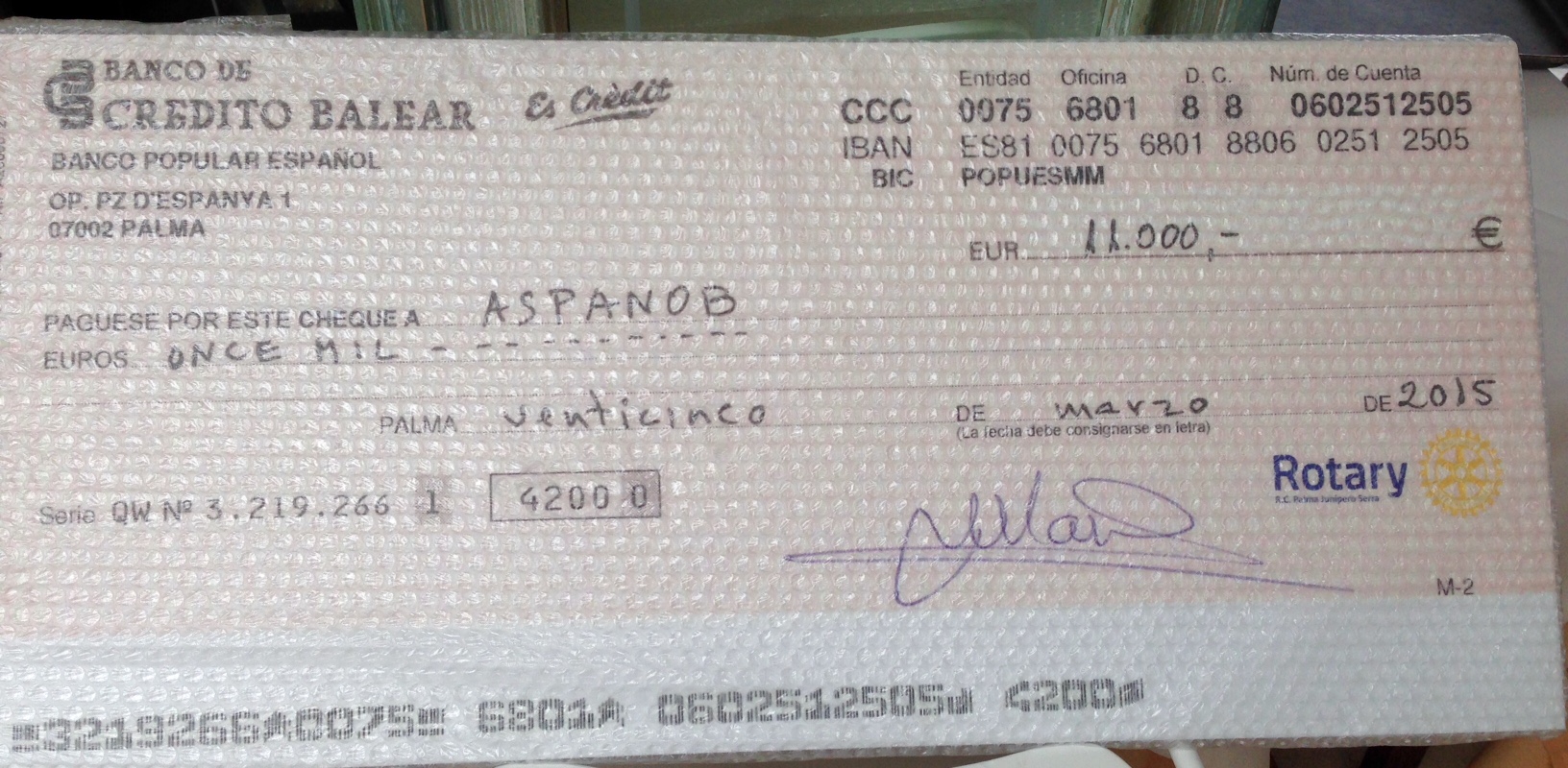 El pasado 25 de Marzo tuvo lugar la entrega de la recaudación del Carnaval Solidario 2015 a la Asociación Aspanob.