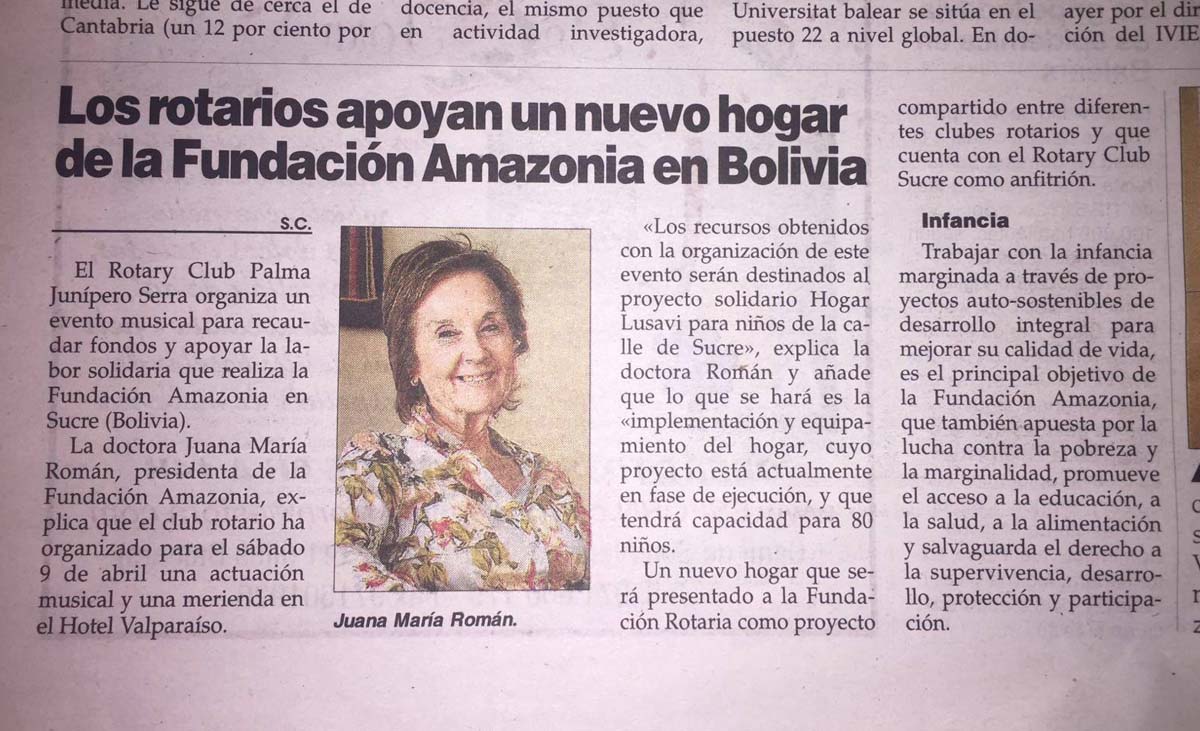 La Fundación Amazonia lucha contra la pobreza y la marginalidad de los niños de la Amazonia y promueve el acceso a la salud, la alimentación, la educación y en muchos casos la supervivencia de su población. La Presidenta de la Fundación Amazonia es la Dra. Juana María Román, miembro del RC Palma Ramón Llull.