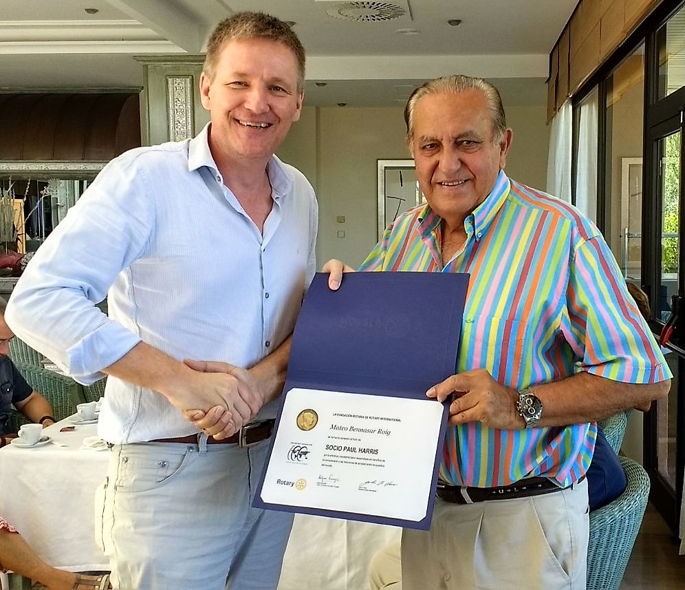 Mateo Bennassar (a la derecha) recibe al máximo honor de Rotary: el Paul Harris Fellow. Por su dedicación, entrega y buen trabajo no solamente en su año como presidente del Rotarc Club Palma Junípero Serra 2016-2017. Le entrega el diploma su sucesor en el cargo, Michael Blum.