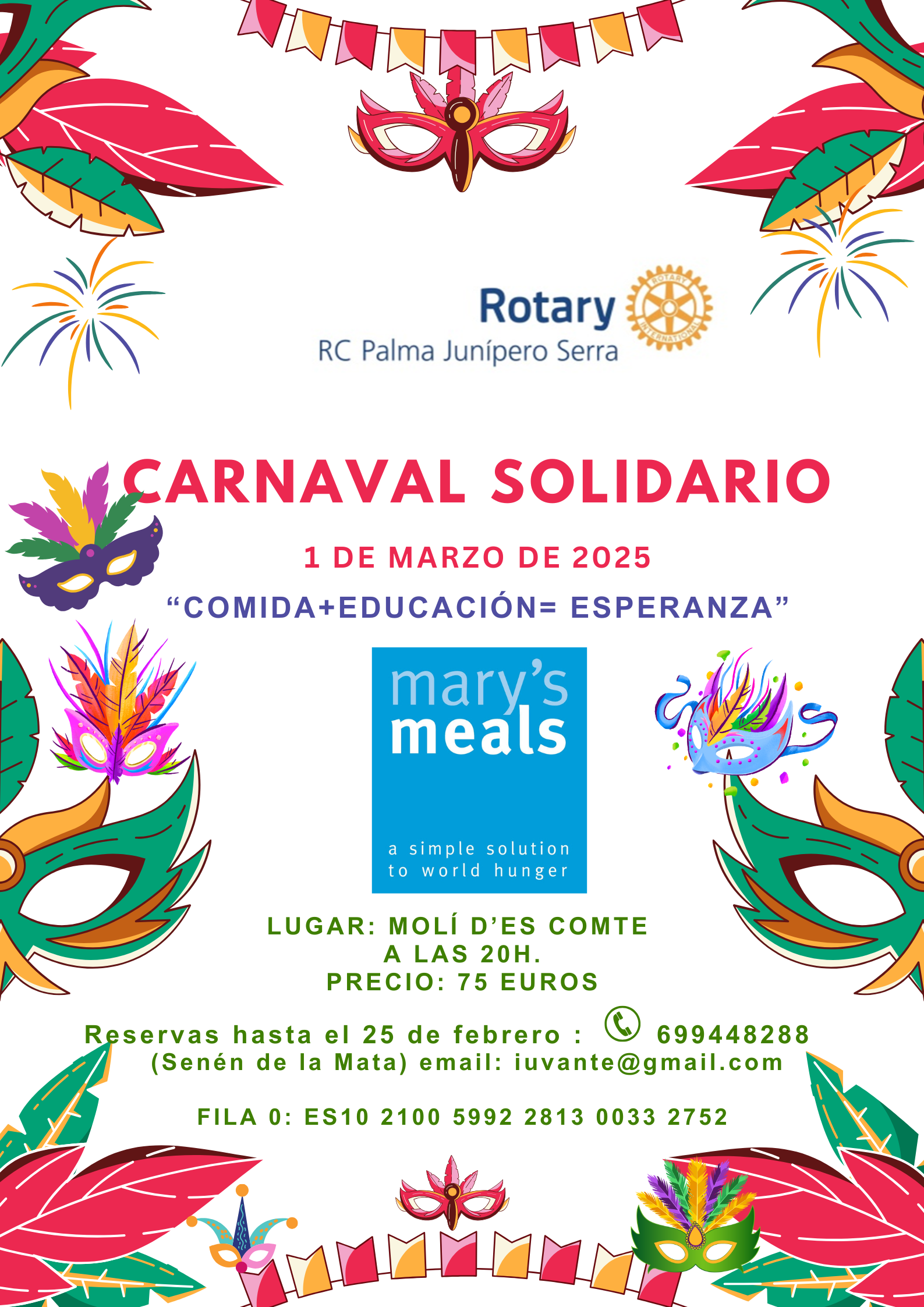 El próximo 1 de marzo el Rotary Club Palma Junípero Serra celebrará un carnaval solidario a favor de la Fundación Mary’s Meals. https://www.marysmeals.es/ Lugar: Molí d’es Compte a las 20 h. Os animamos a participar y a disfrutar de una fiesta muy divertida, con concurso de disfraces, regalos, amenidades, música, bailes…y más ¡Os